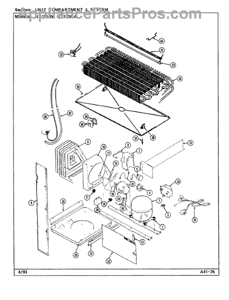 Plastic defrost pan. Evaporator pan hangs from side rails and rests on compressor.