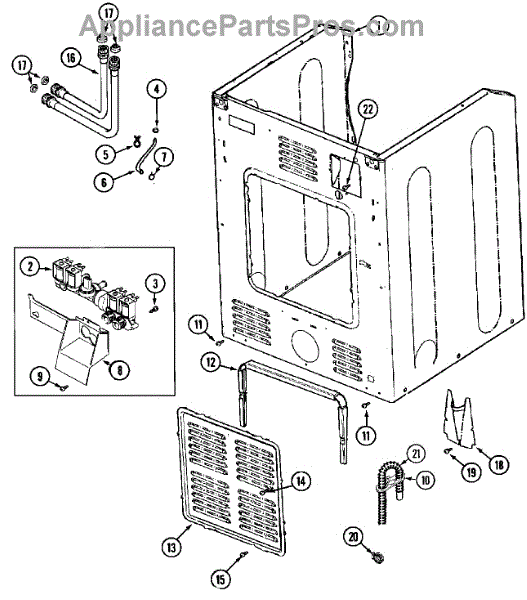 This small strainer sits inside the washer's water inlet valve and screens out sand, rust, and sediment from the supply lines. Replacing a clogged or missing screen restores normal fill flow and helps protect the valve.