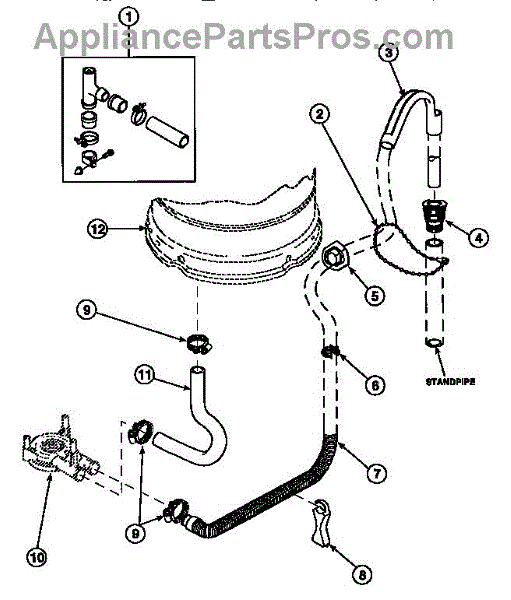 Connects washer drain hose to household standpipe for a secure seal. Replace if cracked, stripped threads, or causing splashing at the drain connection.