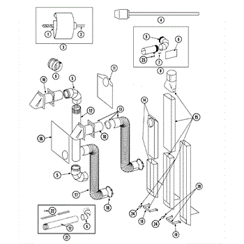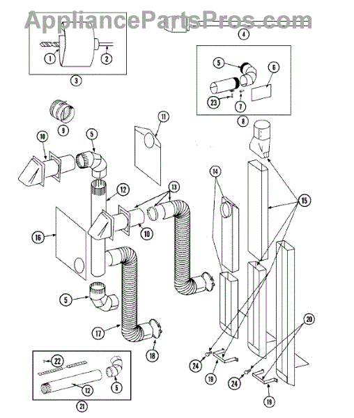 Venting pipe for dryer exhaust system. Connects dryer to external vent. Replace if cracked, damaged, or deteriorated to maintain proper airflow.