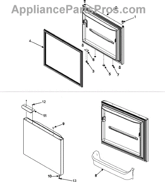 Replacement freezer door handle for bottom-mount refrigerators. Installs on the freezer compartment door. Replace if cracked, broken, or worn from use.