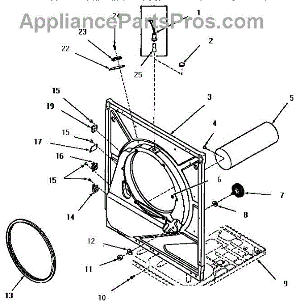 This drum support roller cushions and guides the dryer drum so it turns smoothly and quietly. Replacing a worn roller restores stable drum rotation and reduces noise, vibration, and uneven tumbling. What it does: