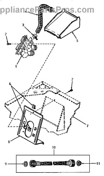 This small strainer sits inside the washer's water inlet valve and screens out sand, rust, and sediment from the supply lines. Replacing a clogged or missing screen restores normal fill flow and helps protect the valve.