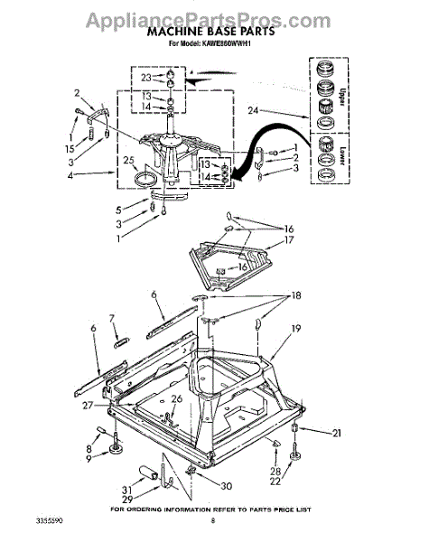 Used for direct drive washing machines. Complete assembly includes 2 level mechanism links, 1 level mechanism spring, 1 knurled pin, 2 rear feet, 1 pad plate, 1 suspension plate, 1 base pad, and 1 suspension spring retainer.