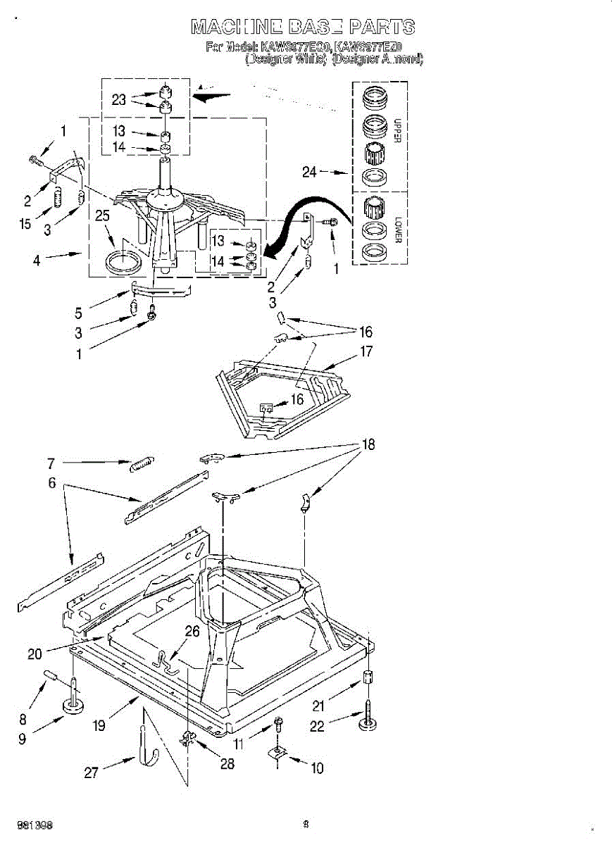 Used for direct drive washing machines. Complete assembly includes 2 level mechanism links, 1 level mechanism spring, 1 knurled pin, 2 rear feet, 1 pad plate, 1 suspension plate, 1 base pad, and 1 suspension spring retainer.