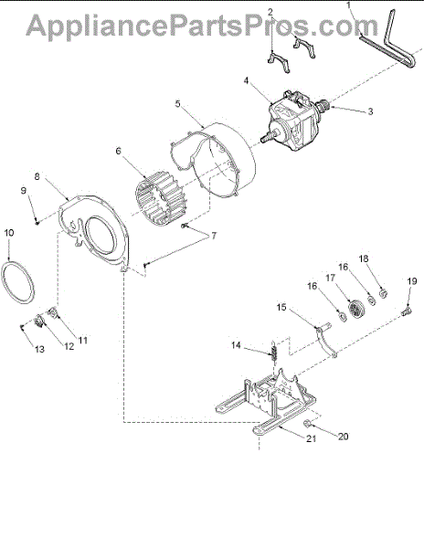 The Belt Tension Pulley is an OEM part for Whirlpool clothes dryers. It utilizes a tension mechanism to maintain precise alignment and contact between the drive belts and motor pulleys during operation. Symptoms of a failed belt tension pulley include: