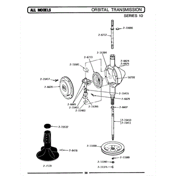 This transmission pinion is the small drive gear inside the gearcase that meshes with the mating gear to transfer motor power through the drive. Replacing a worn pinion restores smooth operation and reliable torque delivery.