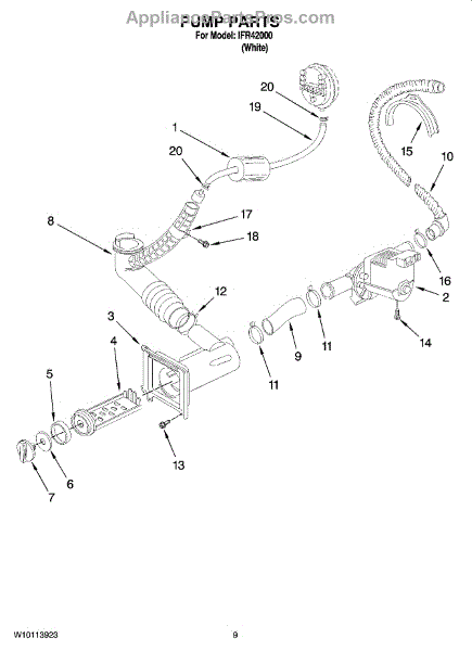 This water recirculation pump moves wash water through the washer's recirculation circuit to help saturate loads and improve cleaning. Replacing a failed pump restores proper water movement and wash performance.