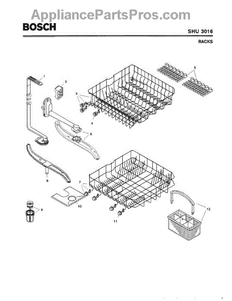 The Silverware Basket Assembly is an OEM part for Bosch dishwashers. This basket is located in the lower rack and is used to hold utensils securely during the wash cycle.