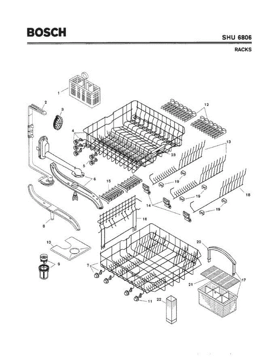 The Silverware Basket Assembly is an OEM part for Bosch dishwashers. This basket is located in the lower rack and is used to hold utensils securely during the wash cycle.