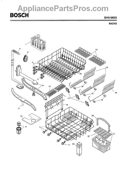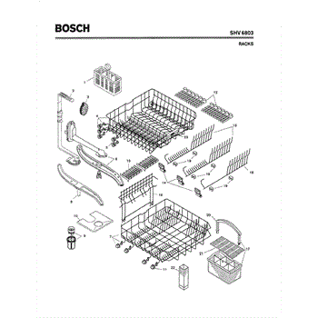 The Silverware Basket Assembly is an OEM part for Bosch dishwashers. This basket is located in the lower rack and is used to hold utensils securely during the wash cycle.