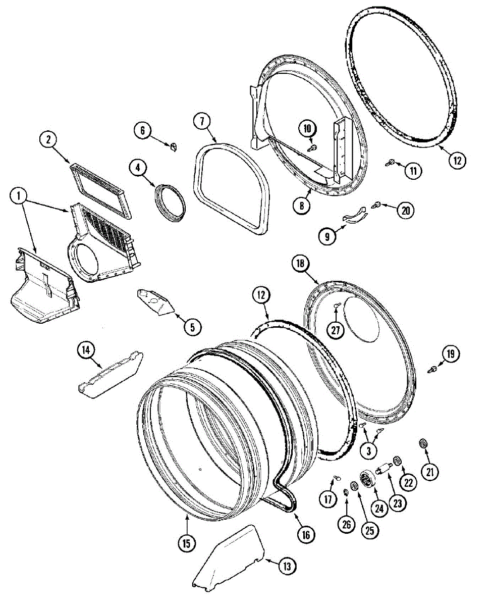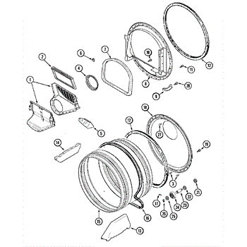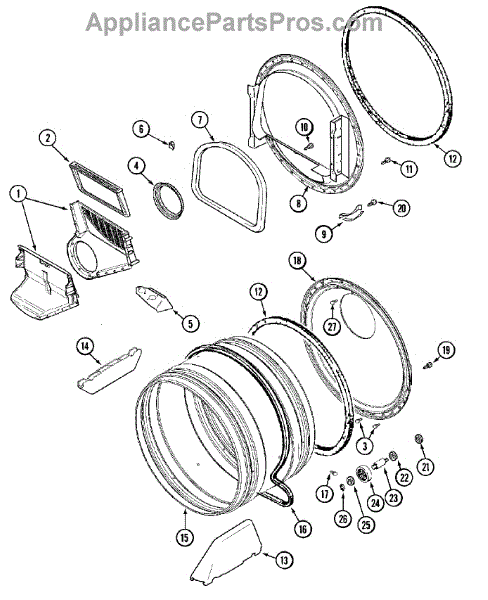 Seals the drum edge to prevent hot air escape and reduce noise. Replace when worn to eliminate metal-on-metal sounds or clothing stains. Confirm fit.