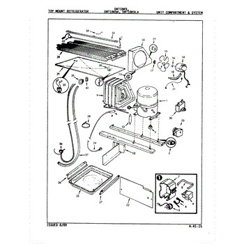 Plastic defrost pan. Evaporator pan hangs from side rails and rests on compressor.