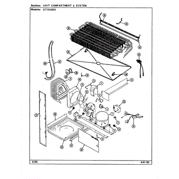 Plastic defrost pan. Evaporator pan hangs from side rails and rests on compressor.