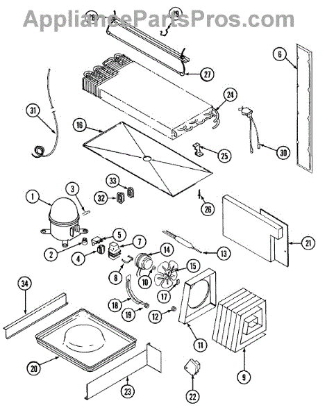 Plastic defrost pan. Evaporator pan hangs from side rails and rests on compressor.