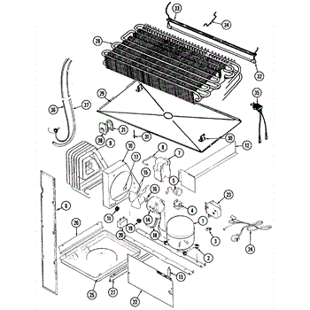 Plastic defrost pan. Evaporator pan hangs from side rails and rests on compressor.