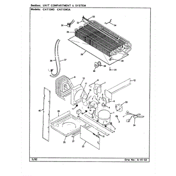 Plastic defrost pan. Evaporator pan hangs from side rails and rests on compressor.