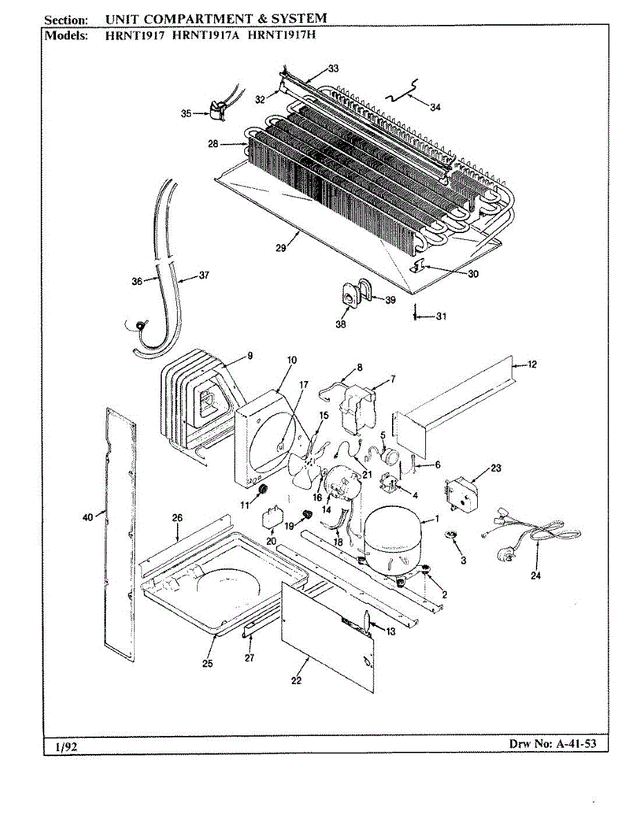 Plastic defrost pan. Evaporator pan hangs from side rails and rests on compressor.