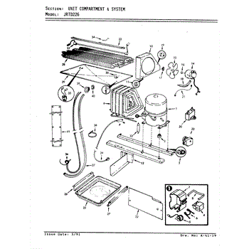 Plastic defrost pan. Evaporator pan hangs from side rails and rests on compressor.