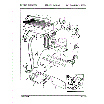 Plastic defrost pan. Evaporator pan hangs from side rails and rests on compressor.