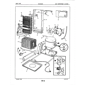 Plastic defrost pan. Evaporator pan hangs from side rails and rests on compressor.