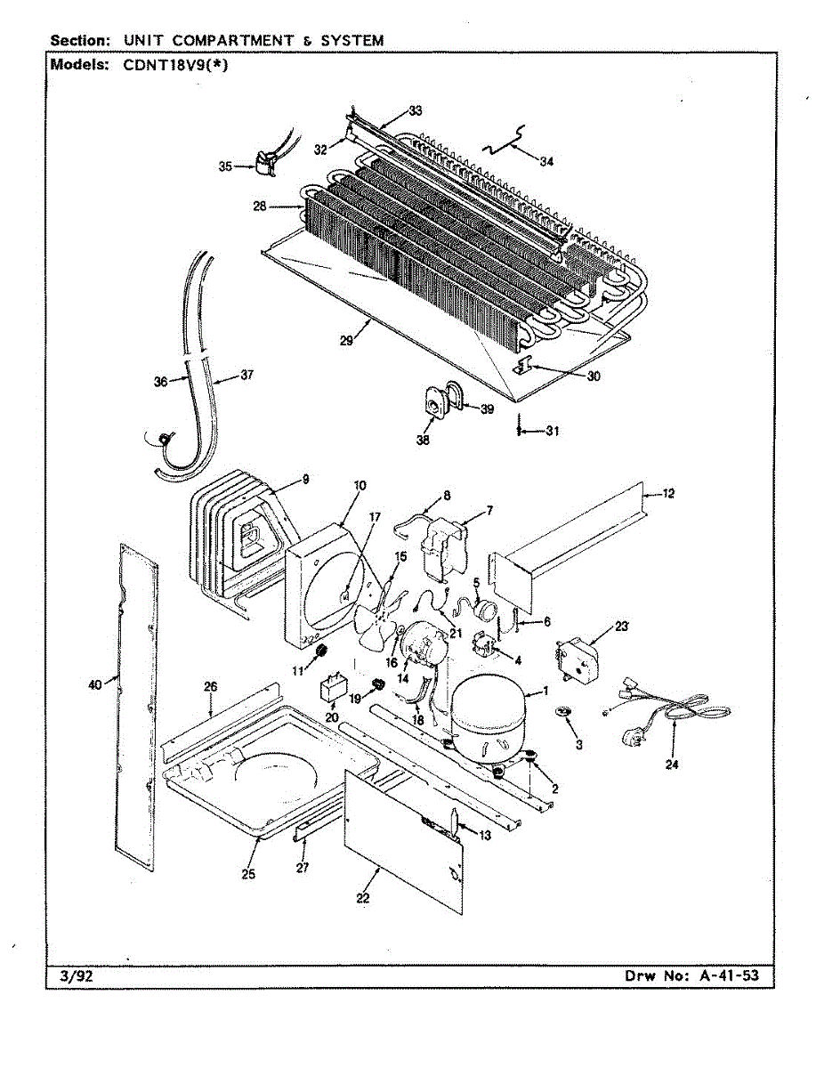 Plastic defrost pan. Evaporator pan hangs from side rails and rests on compressor.