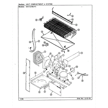 Plastic defrost pan. Evaporator pan hangs from side rails and rests on compressor.