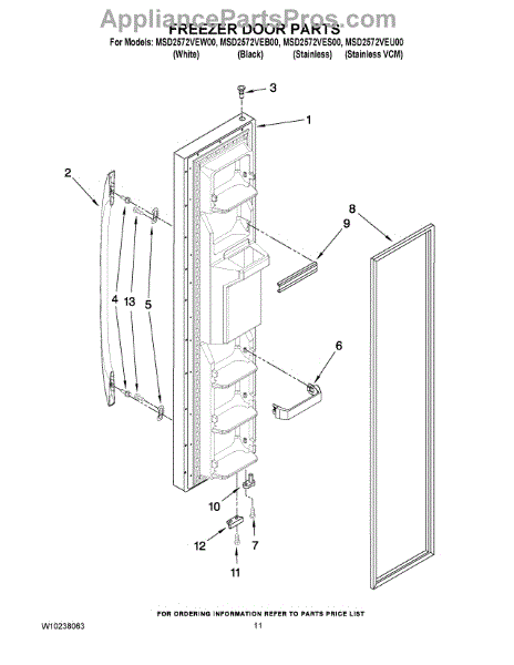Color: Stainless VCM (vinyl coated material). Includes the door gasket, inner door panel and front dispenser parts. The door handle is not included.