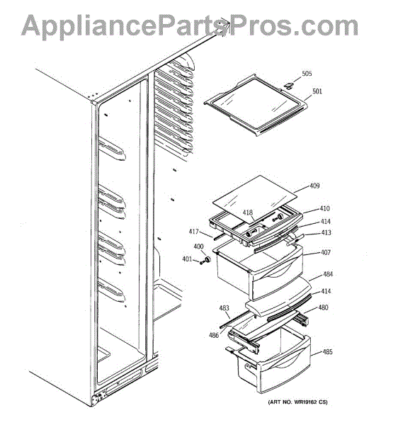 The Drawer Cover is an OEM replacement part for select GE refrigerator vegetable and deli drawers. It protects stored contents from dehydration, contaminants and prolonged illumination while keeping the drawers light-sealed. Proper drawer insulation optimizes food storage conditions. Causes of a bad drawer cover can include cracks and breaks from repeated drawer opening/closing stresses over time. Exposure to produce acids and moisture accelerates degradation of plastic sealing surfaces. Symptoms include: