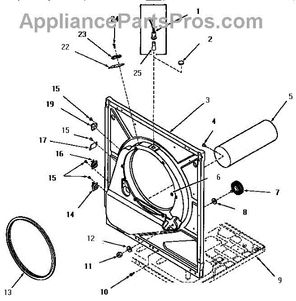 This drum support roller cushions and guides the dryer drum so it turns smoothly and quietly. Replacing a worn roller restores stable drum rotation and reduces noise, vibration, and uneven tumbling. What it does: