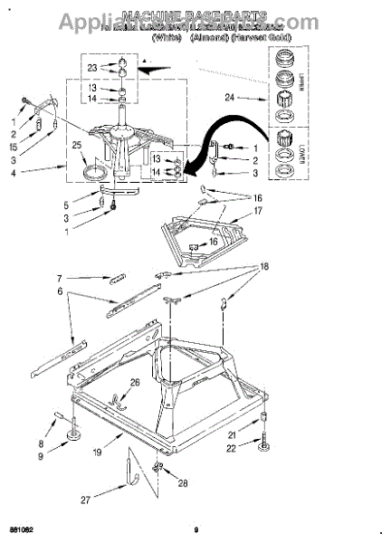 Used for direct drive washing machines. Complete assembly includes 2 level mechanism links, 1 level mechanism spring, 1 knurled pin, 2 rear feet, 1 pad plate, 1 suspension plate, 1 base pad, and 1 suspension spring retainer.