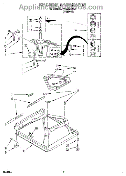 Used for direct drive washing machines. Complete assembly includes 2 level mechanism links, 1 level mechanism spring, 1 knurled pin, 2 rear feet, 1 pad plate, 1 suspension plate, 1 base pad, and 1 suspension spring retainer.