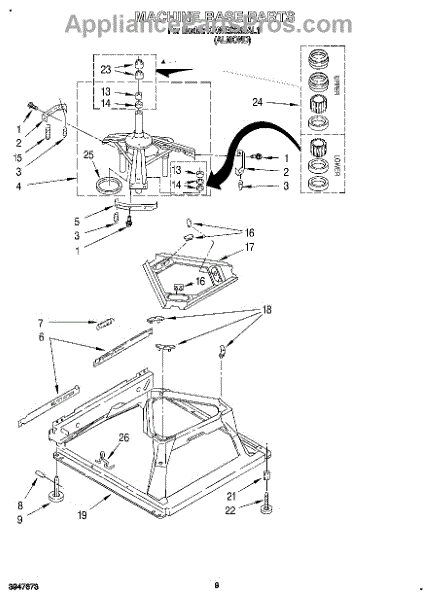 Used for direct drive washing machines. Complete assembly includes 2 level mechanism links, 1 level mechanism spring, 1 knurled pin, 2 rear feet, 1 pad plate, 1 suspension plate, 1 base pad, and 1 suspension spring retainer.