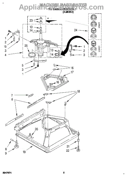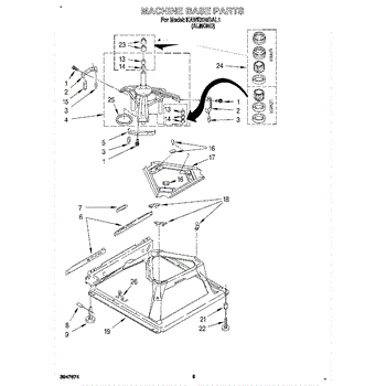 Used for direct drive washing machines. Complete assembly includes 2 level mechanism links, 1 level mechanism spring, 1 knurled pin, 2 rear feet, 1 pad plate, 1 suspension plate, 1 base pad, and 1 suspension spring retainer.