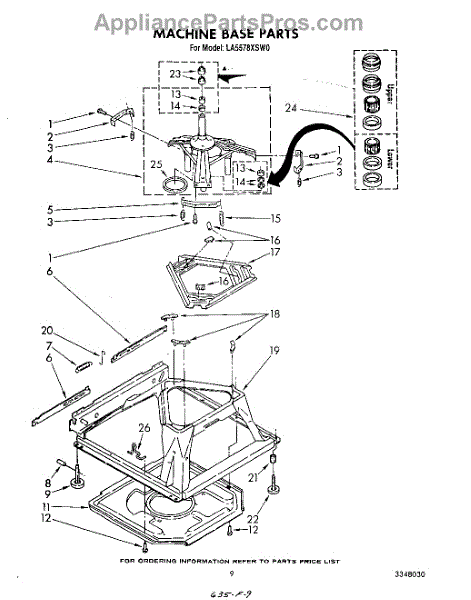 Used for direct drive washing machines. Complete assembly includes 2 level mechanism links, 1 level mechanism spring, 1 knurled pin, 2 rear feet, 1 pad plate, 1 suspension plate, 1 base pad, and 1 suspension spring retainer.