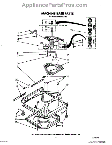 Used for direct drive washing machines. Complete assembly includes 2 level mechanism links, 1 level mechanism spring, 1 knurled pin, 2 rear feet, 1 pad plate, 1 suspension plate, 1 base pad, and 1 suspension spring retainer.