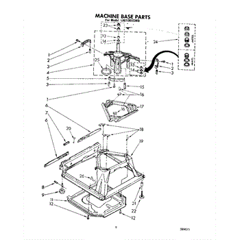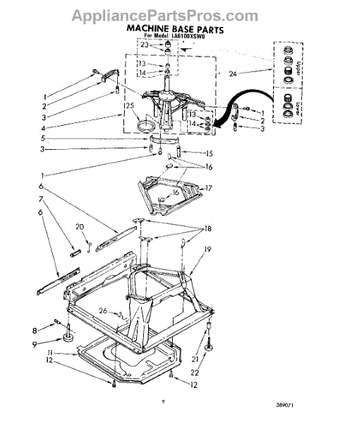 Used for direct drive washing machines. Complete assembly includes 2 level mechanism links, 1 level mechanism spring, 1 knurled pin, 2 rear feet, 1 pad plate, 1 suspension plate, 1 base pad, and 1 suspension spring retainer.