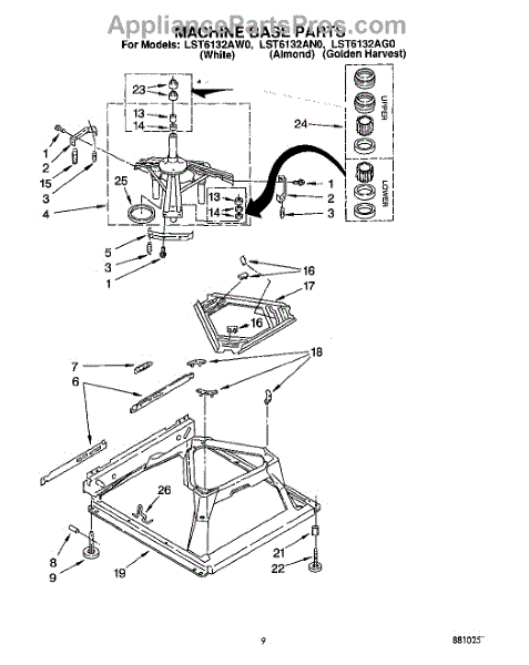 Used for direct drive washing machines. Complete assembly includes 2 level mechanism links, 1 level mechanism spring, 1 knurled pin, 2 rear feet, 1 pad plate, 1 suspension plate, 1 base pad, and 1 suspension spring retainer.