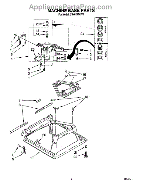 Used for direct drive washing machines. Complete assembly includes 2 level mechanism links, 1 level mechanism spring, 1 knurled pin, 2 rear feet, 1 pad plate, 1 suspension plate, 1 base pad, and 1 suspension spring retainer.