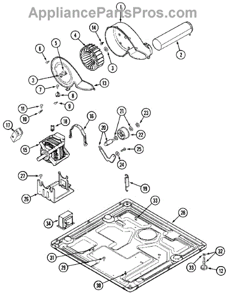 This dryer blower housing encloses the blower wheel and directs air from the drum through the lint filter to the exhaust vent. Replacing a damaged housing restores proper airflow for consistent drying and helps keep lint contained within the airflow path.