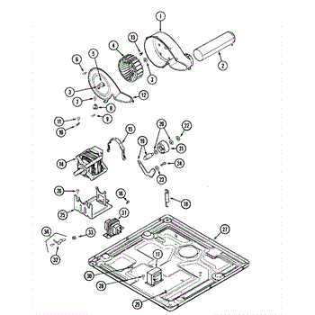 This dryer blower housing encloses the blower wheel and directs air from the drum through the lint filter to the exhaust vent. Replacing a damaged housing restores proper airflow for consistent drying and helps keep lint contained within the airflow path.