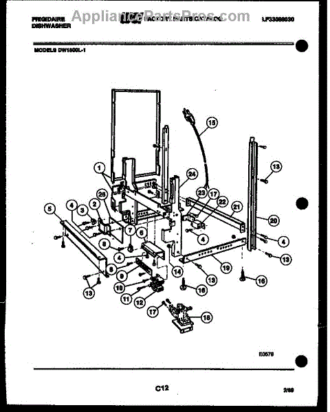 Black screw secures dishwasher access panels and kick plate assemblies. Replace missing or stripped screws during panel removal or appliance repair.