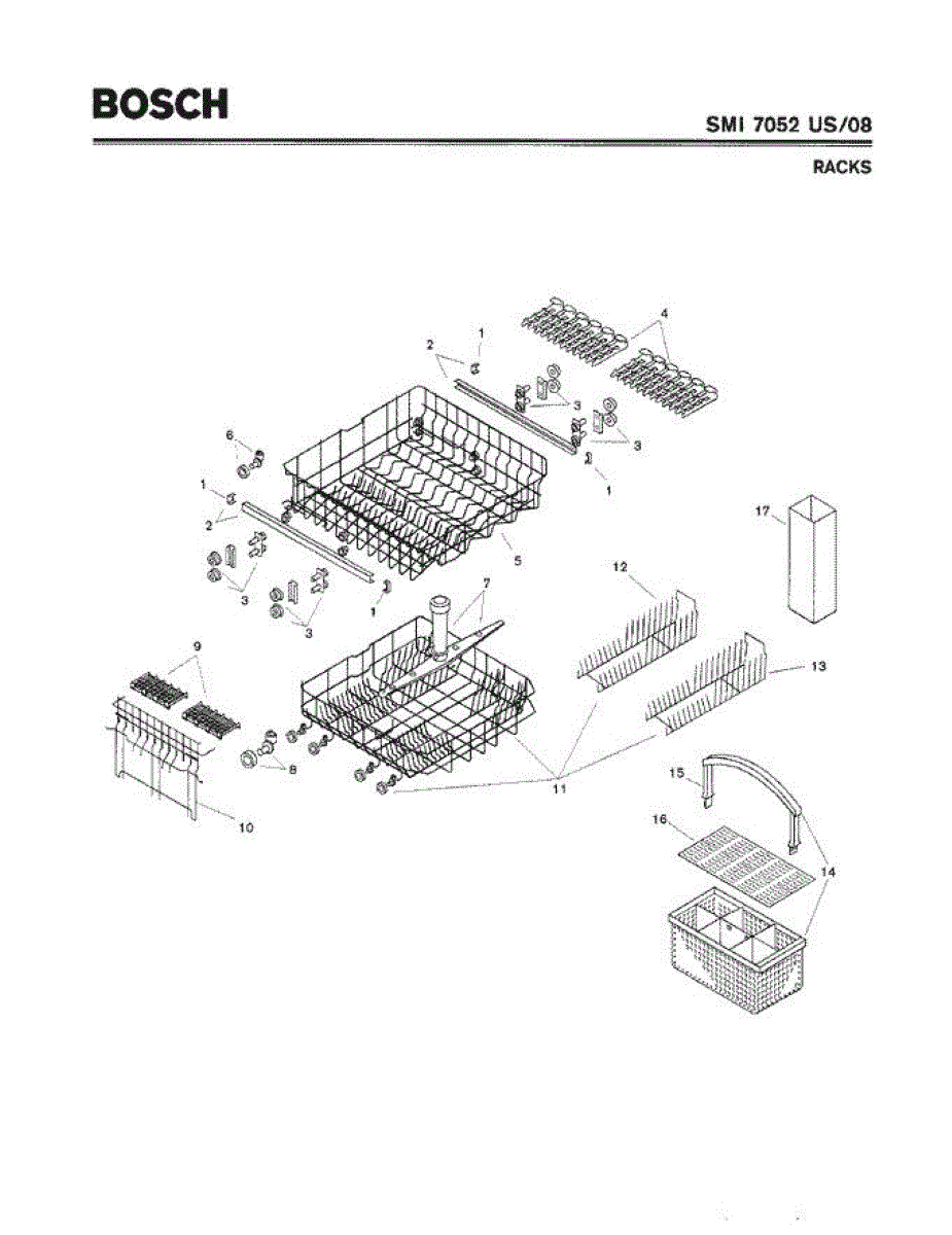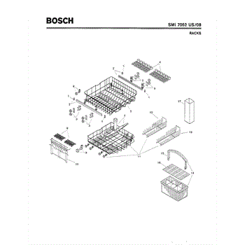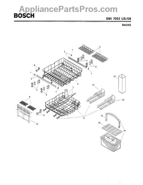 The Silverware Basket Assembly is an OEM part for Bosch dishwashers. This basket is located in the lower rack and is used to hold utensils securely during the wash cycle.