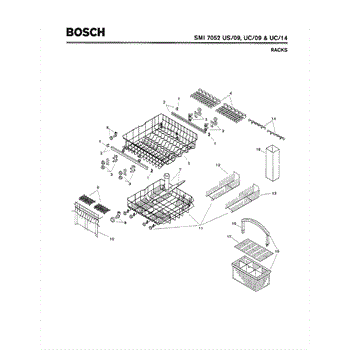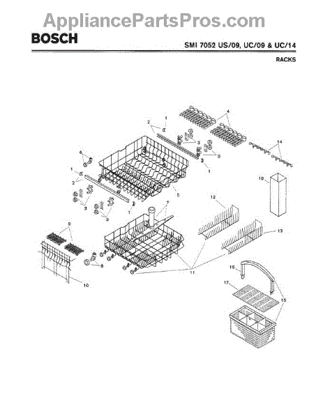 The Silverware Basket Assembly is an OEM part for Bosch dishwashers. This basket is located in the lower rack and is used to hold utensils securely during the wash cycle.