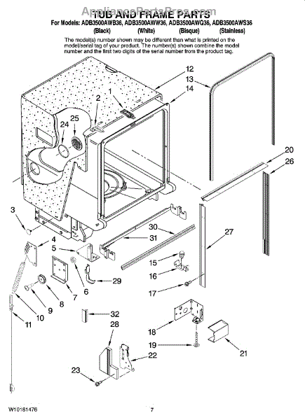 This Tub Edge Trim (bottom) fits along the lower edge of the dishwasher tub opening. Replacing a cracked, warped, or missing trim restores a clean finished edge and helps the door open and close smoothly without rubbing or snagging.