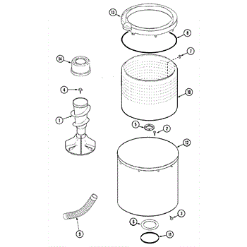 This tub-to-pump hose connects the washer's outer tub to the drain pump, carrying water out of the machine during the drain cycle. Replacing a cracked or clogged hose can help stop leaks and restore consistent draining.