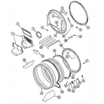 Seals the drum edge to prevent hot air escape and reduce noise. Replace when worn to eliminate metal-on-metal sounds or clothing stains. Confirm fit.