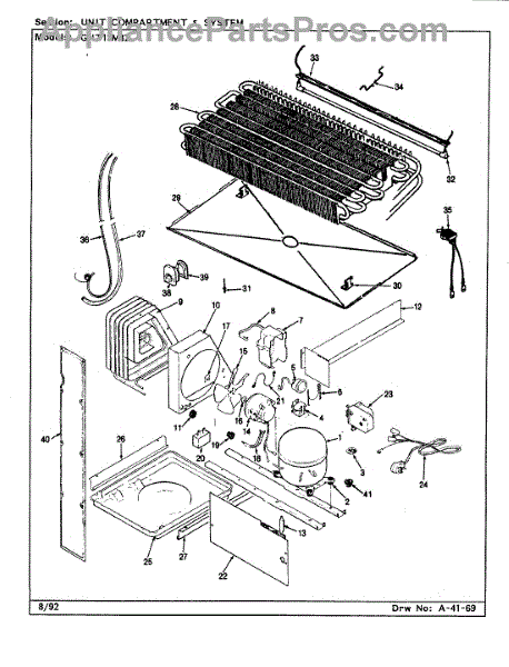 Plastic defrost pan. Evaporator pan hangs from side rails and rests on compressor.