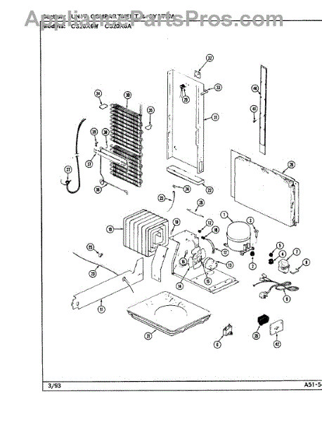 Plastic defrost pan. Evaporator pan hangs from side rails and rests on compressor.