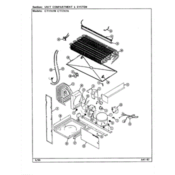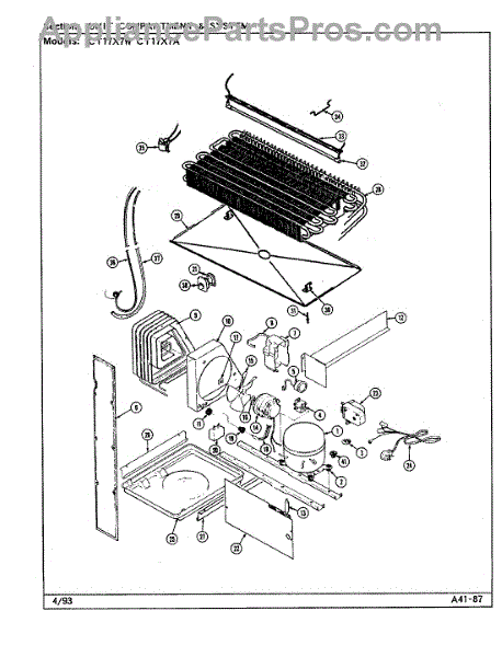Plastic defrost pan. Evaporator pan hangs from side rails and rests on compressor.